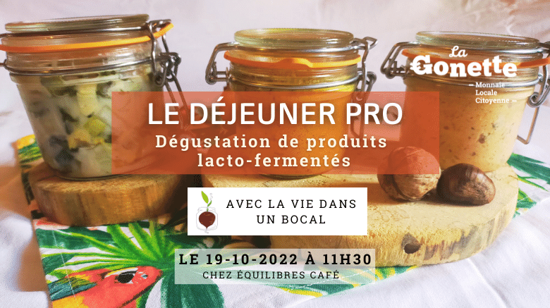 La Gonette convie ses partenaires pros et tout.e professionnel.le curieux.se, le mercredi 19 octobre à 11h30 à une dégustation des produits lacto-fermentés de La Vie Dans Un Bocal ! Dégustation suivie d’un déjeuner à Equilibres Café (4 Rue Terme, 69001 Lyon).