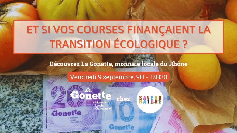 Et si vos courses chez Saveur Nature finançaient la transition écologique et solidaire ? Avec La Gonette c’est possible ! Pour en savoir plus sur votre monnaie locale et échanger de vive-voix, nous vous donnons rendez-vous vendredi 9 septembre de 9H à 12H30 chez Saveur Nature !
