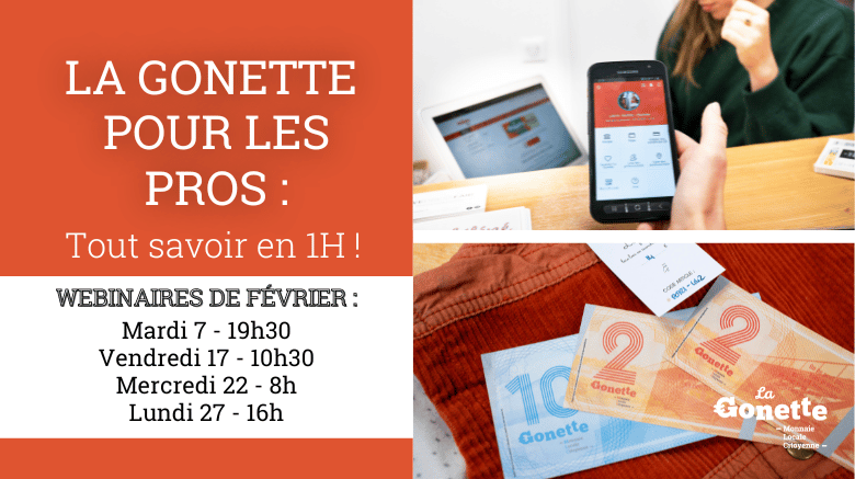 Nous animons toutes les semaines un webinaire d’1h qui s’adresse aux commerçants, professions libérales, associations, producteurs, collectivités locales, fondations, artisans et TPE/PME, qui considèrent l’argent comme un outil au service de l’Humain et qui veulent favoriser des échanges dans la proximité et dans l’économie réelle.
