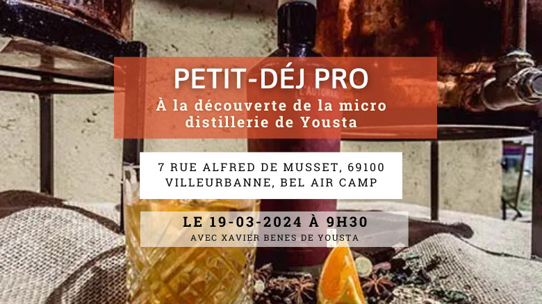 La Gonette vous convie le mardi 19 mars 2024 à 09h30 pour un petit-déj entre pros à la découverte de la micro-distillerie Yousta (7 rue Alfred de Musset, 69100 Villeurbanne, BEL AIR CAMP). Xavier nous présentera les locaux et les différents processus de fabrication des boissons ainsi que les valeurs portées par Yousta.