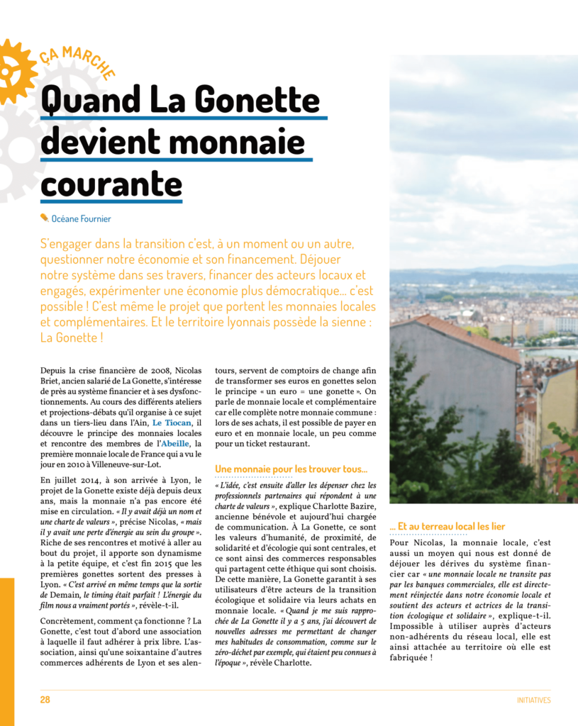 « S’engager dans la transition, c’est à un moment ou à un autre, questionner notre économie et son financement. Déjouer notre système dans ses travers, financer des acteurs locaux et engagés, expérimenter une économie plus démocratique… c’est possible ! C’est même le projet que portent les monnaies locales et complémentaires. Et le territoire lyonnais possède la sienne : La Gonette ! »